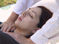 בן הזוג: שב מעבר לראשה של אשתך והשאר בכל אחת מהתנוחות הבאות במשך כמה דקות: 1 . הנח ידייך על הרקות של אשתך, אצבעות מופנות כלפי כתפיה. (תמונה 1) 2 . הנח ידיך על עיני אשתך מבלי להפעיל לחץ, כשהאצבעות מופנות כלפי מטה (תמונה 2). 3 . הנח ידיך ברכות על אזני אשתך מבלי להפעיל לחץ כשהאצבעות מופנות כלפי מטה. (תמונה 3) . 4 . הנח ידיך על עצמות הבריח של אשתך (תמונה 4). מנח ב' (תמונות 5-7):